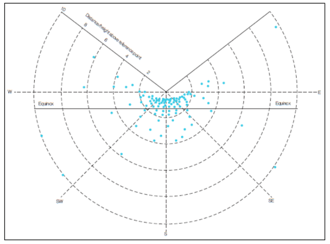 The way that APSH is typically calculated in a Daylight and Sunlight Assessment is through the use of a Sunlight Availability Indicator, as shown in Figure 1 below. This indicator is for London, and each of the blue dots approximates 0.5% of APSH (from a total 1486 hours).