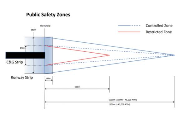Regardless of the number of commercial ATMs per year, the higher risk PSRZ is defined as 500m from the runway threshold.