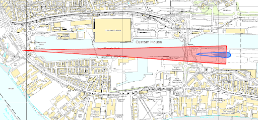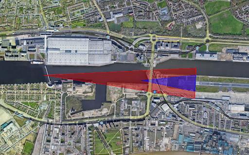 Figure 3 [6] below shows the new PSZ for London City Airport based on the 2021 policy with respect to runway 09 [7]. The blue area shows the PSRZ and the red area shows PSCZ.