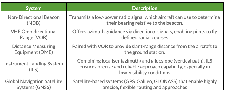 The table shows that different navigation systems are often used in tandem to provide the greatest context to a pilot and to maximise accuracy. For example, the glide path and localiser facilities used for an ILS are two separate facilities located in different places on the aerodrome. Yet, the information is presented to the pilot on a single instrument in the cockpit.