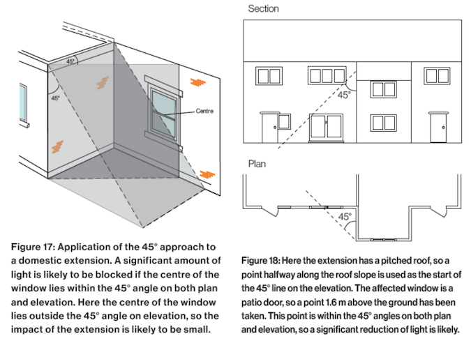 Simplistically, the 45° Rule is applicable where a development or extension is beside a window, whilst the 25° Rule is used for developments opposite a window.