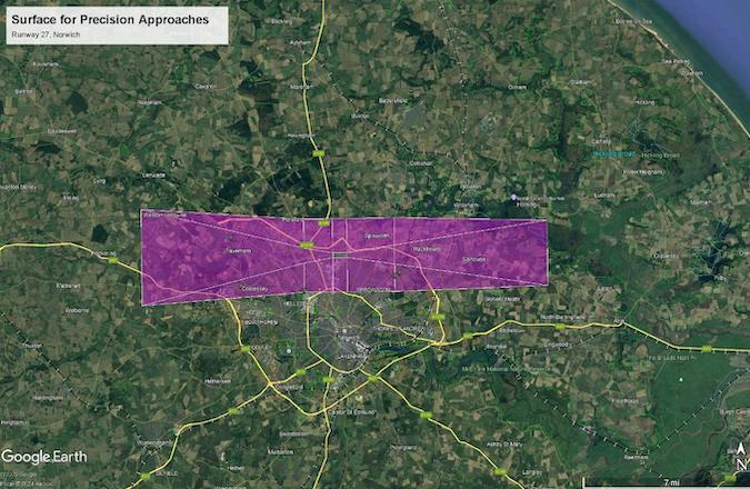 Figure 1: Pager Power modelling output for a potential Surface for Precision Approach at Norwich Airport Runway 27, overlaid on Google Earth imagery. This consists of the approach component (right trapezium), missed approach component (left trapezium) and transitional component (above and below) . This figure is given for illustrative purposes only [1].