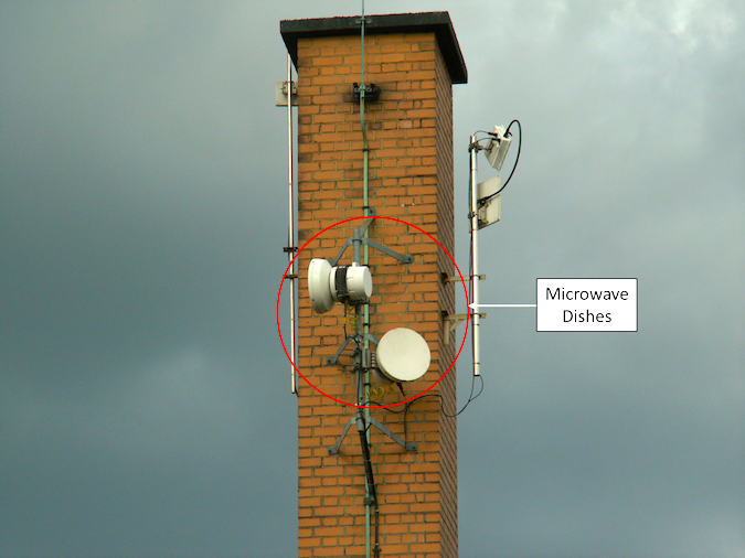 In figure 2 below you will see two fairly standard microwave dishes mounted to a chimney. It is common that the dishes are white in colour. These dishes are directional meaning they are orientated in the direction of the corresponding link end. Microwave links also require radio line of sight to operate and therefore, depending on the dish height, it is possible that (on a clear day) you could see the corresponding link end, maybe with the assistance of binoculars. This does however depend on the length of the link path.